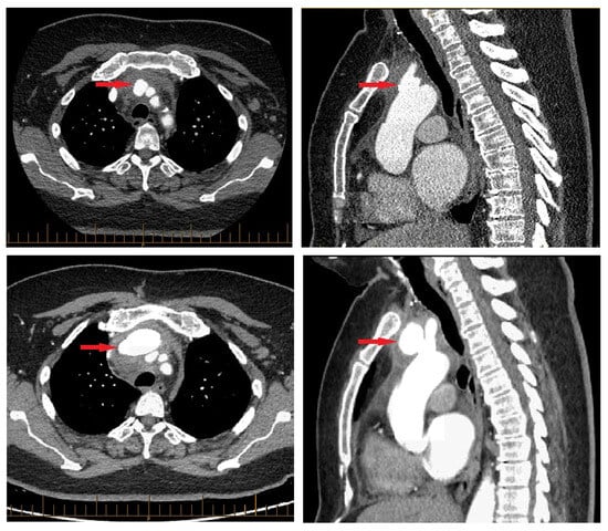 CT revealed a pseudoaneurysm (7 × 5.5 mm) at the common origin of the brachiocephalic trunk, and the left common carotid artery was incidentally found (