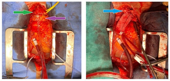 Figure 3). Once the graft was de-aired, it was cross-clamped, systemic perfusion was re-established, and rewarming began. The proximal anastomosis between the trimmed native ascending aorta and the graft was then completed with continuous 4-0 Prolene following a single dose of antegrade cold-blood cardioplegia. Patch repairs were then performed on the right femoral and axillary arteriotomies; the right femoral venotomy was closed with a simple purse-string suture. Intra-operative and post-repair trans-esophageal echocardiography confirmed satisfactory ventricular function and no residual air. Aortic specimens were positive for