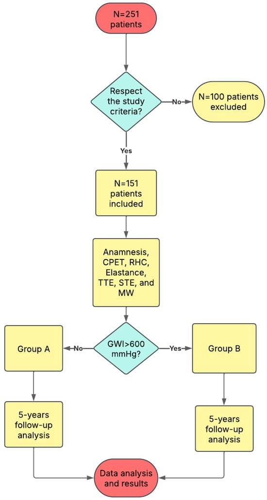 RHCs were performed by experienced operators using a pulmonary artery catheter inserted via the internal jugular vein, zeroed to atmospheric pressure, and referenced at the mid-thoracic level. Cardiac output (CO) was evaluated by the thermodilution method according to current guidelines, using cold water injections for three measurements with a variability <10% [10,11,12,13], and calculated as the mean of the three measurements. All pressures were recorded as the average of eight time-pressure integral derivations during several respiratory cycles [10,11,12,13].