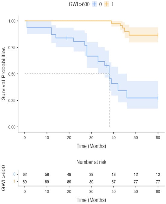 Patients were classified into two groups according to LVGWI. The threshold of 600 mmHg% was chosen a priori on the basis of receiver operating characteristic (ROC) curve analysis in our cohort, corresponding to the maximum Youden index for predicting five-year cardiovascular death or HF-related hospitalisation. Although prior studies have proposed different thresholds [3], our ROC-derived cut-off offered the best balance between sensitivity and specificity in this specific population. Group A comprised patients with LVGWI ≤ 600 mmHg%, and Group B comprised those with LVGWI > 600 mmHg%.