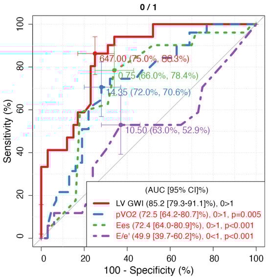 ROC curves of 5-year CV mortality regarding parameters with the highest AUC for each technique. LV GWI: Left Ventricle Global Work Index; pVO2: peak of oxygen consumption expressed as mL/kg/min; Ees: end-systolic elastance.