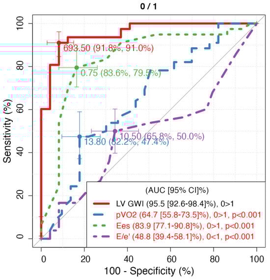 ROC curves of 5-year CV hospitalization regarding parameters with the highest AUC for each technique. LV GWI: Left Ventricle Global Work Index; pVO2: peak of oxygen consumption expressed as mL/kg/min; Ees: end-systolic elastance.