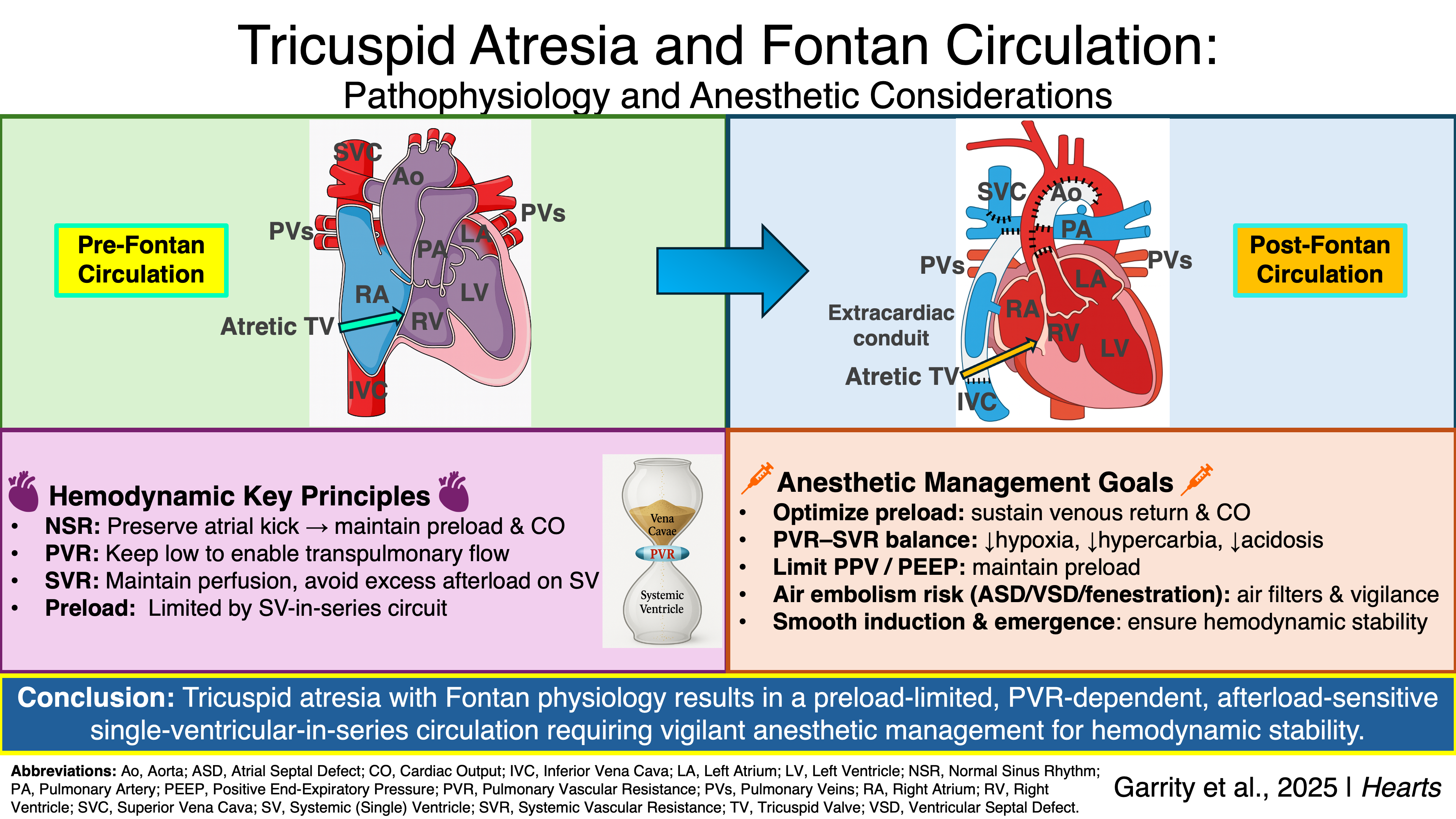 Garrity, M.; Poppers, J.; Richman, D.; Bacon, J. Tricuspid Atresia and Fontan Circulation: Anatomy, Physiology, and Perioperative Considerations. Hearts 2025, 6, 30. https://doi.org/10.3390/hearts6040030