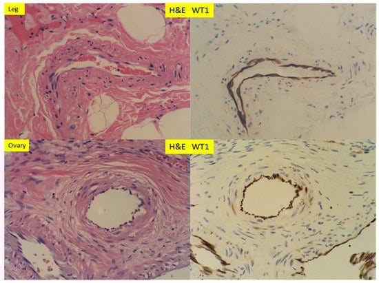Hematoxylin and eosin (H+E) staining and immunostaining for Wilm’s tumor 1 gene (WT1) expression of muscular arteries in the soft tissue of the lower leg, after traumatic amputation and the ovary tissue of peri-menopausal women (400× magnification).