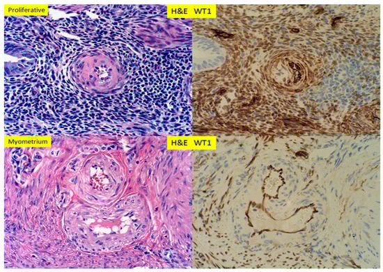 H+E staining and immunostaining for WT1 expression of proliferative endometrium, with glandular, stromal cells and spiral artery and myometrium with spiral artery (400× magnification).