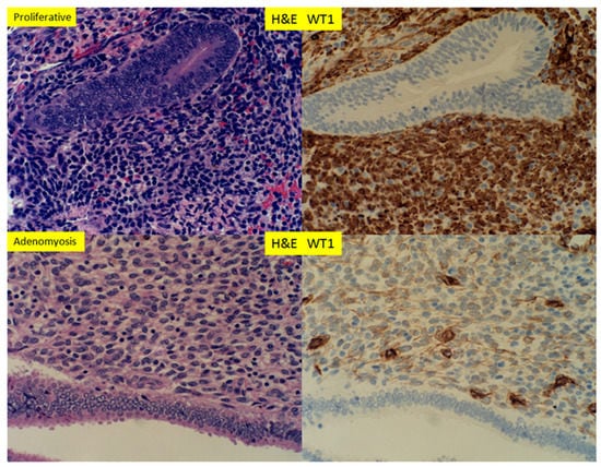 H+E staining and immunostaining for WT1 expression of proliferative endometrium and adenomyosis in hysterectomy specimen. Noted a significant reduction of WT1 signals within the stromal cells (400× magnification).
