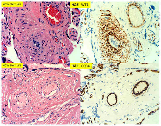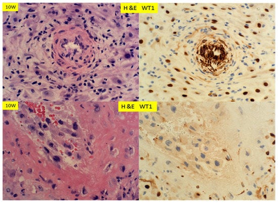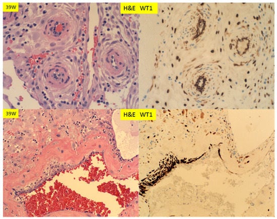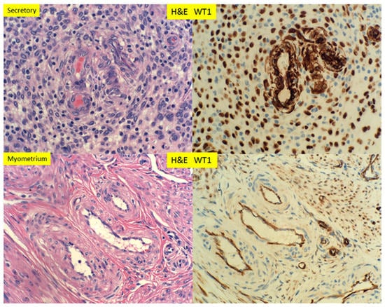 Wilm’s tumor 1 gene (WT1) is a tumor suppressor gene discovered in patients of Wilm’s tumor, a high grade pediatric malignancy with versatile molecular functions [10,11,12,13,14,15]. WT1 is a transcription factor regulating a large number of target gene expressions, mediating a variety of cellular functions in organ development, homeostasis and diseases [16,17]. Mutations of WT1 gene were shown to be associated with Denys–Drash syndrome and Frasier syndrome, and deletion of the short arm of the chromosome 11 containing WT1 gene is associated with WAGR syndrome (Wilm’s tumor, anirida, genitourinary anomalies, and mental retardation) [15,18,19]. WT1 is interacting with many different cellular partner proteins important for various cellular activities [10,15]. Normal WT1 gene function is critical for the development of urogenital system, mesothelial cell function and vascular endothelial cell functions [15]. Clinically, WT1 gene is also important for adult kidney function and cardiovascular functions [15,20]. In pathology practice, immunohistochemical staining for WT1 serves as a marker for ovarian carcinoma, mesothelial cell and endothelial cell lineages [21,22]. There is abundant WT1 gene expression in the endometrium by RNA microarray studies (human protein atlas https://www.proteinatlas.org/), but the function of WT1 in endometrium is yet to be defined, especially when the endometrium undergoes significant changes during the menstrual cycle and pregnancy. As initial steps, expression of WT1 protein in endometrium by immunohistochemical staining was attempted to locate the WT1 protein expression during menstrual cycles and pregnancy. These results will provide the global view of WT1 gene expression in endometrium during the changes of menstrual cycle and pregnancy, with particular emphasis on maternal vascular remodeling during pregnancy and vascular restoration after pregnancy.