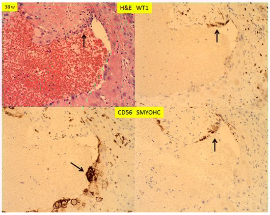 H+E staining and immunostaining for WT1, CD56 and smooth muscle myosin heavy chain (SMYOHC) expression of decidual vessels in the membrane roll (vera) and decidua basalis at term (decidual vasculopathy), at 38 weeks. Arrows indicate the focus of regenerating endothelium and smooth muscle cells with the remaining endovascular trophoblasts (200× magnification).