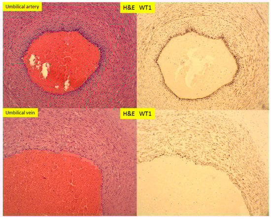 H+E staining and immunostaining for WT1 expression of umbilical artery and vein of 39-week placenta (100× magnification).