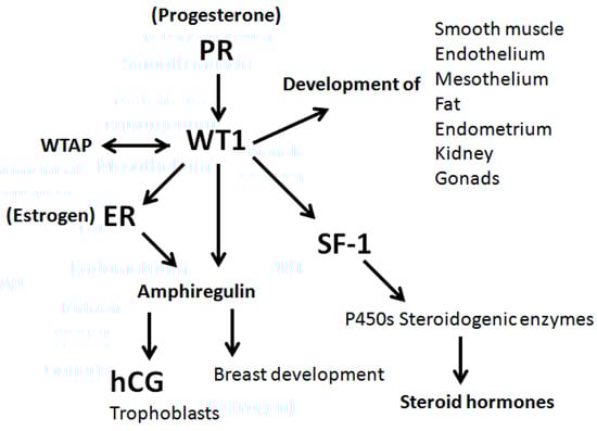 - Anthony, F.W.; Mukhtar, D.D.; Pickett, M.A.; Cameron, I.T. Progesterone up-regulates WT1 mRNA and protein, and alters the relative expression of WT1 transcripts in cultured endometrial stromal cells. J. Soc. Gynecol. Investig. 2003, 10, 509–516. [Google Scholar] [CrossRef]