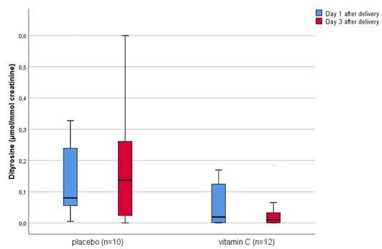 Dityrosine values did not differ significantly between the two study groups at day one after delivery (p = 0.23), but were significantly lower in the vitamin C group compared to the placebo group at day three after delivery (p = 0.04) (Figure 2). Differences in dityrosine values between day one and day three after delivery reached statistical significance in neither the placebo group (p = 0.46) nor the vitamin C group (p = 0.22).