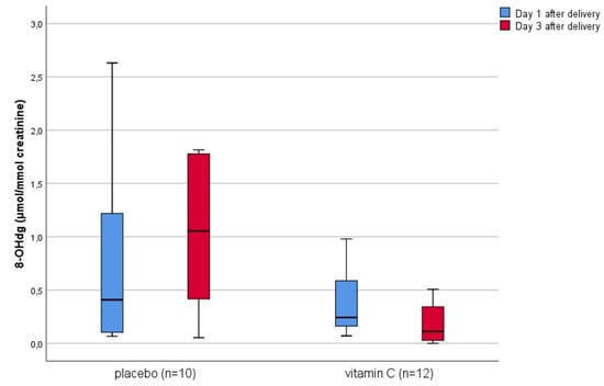 Values of 8-OHdg did not differ significantly between the two study groups at day one after delivery (p = 0.77), but were significantly lower in the vitamin C group compared to the placebo group at day three after delivery (p = 0.03) (Figure 3). Differences in 8-OHdg values between day one and day three after delivery reached statistical significance in neither the placebo group (p = 0.26) nor the vitamin C group (p = 0.26).