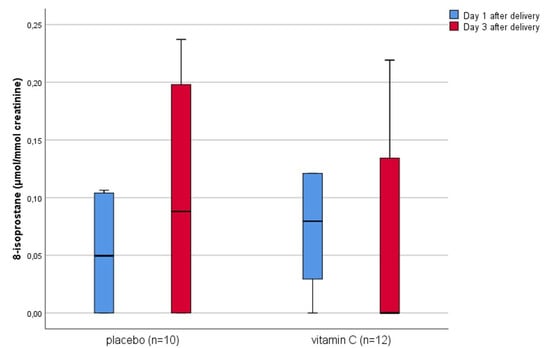 Values of 8-isoprostane did not differ significantly between the two study groups at day one as well as at day three after delivery (p = 0.41 and p = 0.25, respectively) (Figure 4). Differences in 8-isoprostane values between day one and day three after delivery reached statistical significance in neither the placebo group (p = 0.26) nor the vitamin C group (p = 0.39).