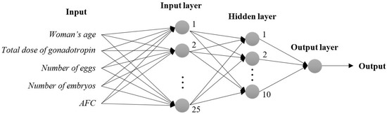 Therefore, seven variables (i.e., woman’s age, total dose of gonadotropin, average daily dose of gonadotropin, number of eggs, number of embryos, AMH level and AFC) were gathered as possible input variables for the ANN model. However, through the applied methodology during the study of the first model it was recognized that not all of these seven variables were necessary to integrate the input set, taking into account that the model’s performance did not increase. Then, the ANN model achieved the desirable results using the five variables already mentioned above.