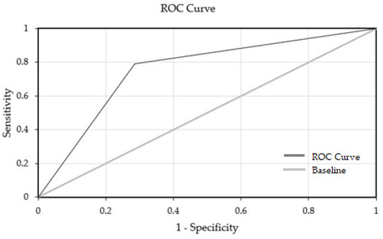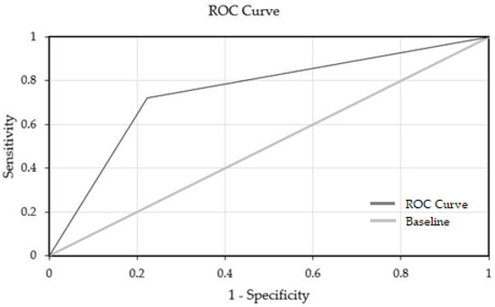 Following the first approach to estimate the success rate to have a live birth, and since there are no easy explanations for the links between the weights and the input and output variables, a decision tree was built (Figure 4), which allows a simpler link between the input and output variables. Although the same five input variables of the ANN model were used, only three (i.e., woman’s age (years), total dose of gonadotropin (IU) and number of embryos) have shown to be important for the determination of the output variable. Table 4 lists the predictor importance of each variable. Overall, the accuracy was 75.0% while the AUROC was 74.9% (95% CI 72.3–77.5%) (Figure 5).