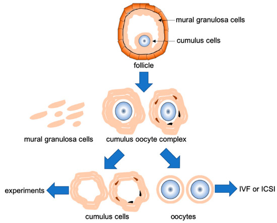 Flow chart for collecting samples. Flow chart of collecting cumulus cells from cumulus–oocyte complex (COC). COCs were retrieved from stimulated follicle by hormones. Mural granulosa cells and COCs were isolated from follicular aspirates. The maturity of COCs was evaluated based on morphologic criteria. Evaluated cumulus cells were physically detached from COCs. Obtained cumulus cells were used in experiments and oocytes were used for assisted reproductive technology (ART) by in vitro fertilization (IVF) or Intracytoplasmic sperm injection (ICSI).