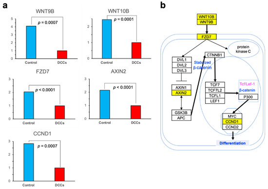 Among downregulated genes, we focused on those associated with Wnt signaling, since they were reportedly associated with the state of oocytes and cumulus cells [20,21]. When relative values of gene expressions were estimated, the expressions of five genes were significantly reduced in DCCs. Two cytokines (WNT9B and WNT10B) were significantly downregulated in DCCs (4.095 vs. 1.0, and 2.444 vs. 1.0, DCCs and the control, respectively; p = 0.0007 and p = 0.0001). Frizzled-7 (FZD7), one of the Wnt receptors, was expressed in cumulus cells, and its expression was significantly reduced in DCCs (2.052 vs. 1.0; p < 0.0001). AXIN2 binds to various proteins constituting the Wnt signaling pathway, and its expression was also significantly reduced in DCCs (2.150 vs. 1.0; p < 0.0001). Besides, the expression of Cyclin D1 (CCND1), a representative gene among target genes associated with cell proliferation and the cell cycle, was also reduced in DCCs (2.835 vs. 1.0; p = 0.0001) (Figure 3a). As depicted in Figure 3b, we presumed that these reduced gene expressions impair the transduction of the Wnt signaling pathway in the DCCs.