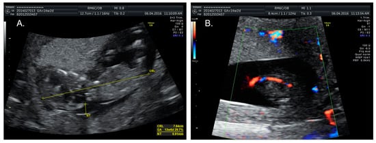 Prenatal ultrasound images of Case 1, taken during the first trimester. (A) Nuchal fold measurement shows increased fetal nuchal translucency (NT) of almost 7 mm; (B) Single umbilical artery.
