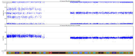 SNP array result of chromosome 9 of Case 2. Upper panel: B allele frequency, showing a ‘split’ along the short arm of chromosome 9 because of the additional genotypes AAAB, AABB, and ABBB. Lower panel: The logR ratio of the SNPs on the short arm of chromosome 9 is increased as compared to those on the long arm, given that 4 copies are present instead of 2.