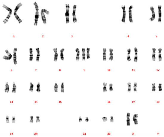 Karyogram of Case 1, showing a 47,XX,+der(9)(pter→q21::p12→pter) karyotype. The derivative chromosome 9 consists of the short arm of chromosome 9, the centromere, a part of the long arm (up to chromosome band 9q21), followed by an additional copy of most of the short arm.