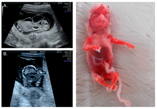 A healthy 36-year-old, G4P2A1, was referred at 13 weeks of gestation for prenatal diagnostics because of hydrops fetalis (Figure 4A). An abdominal ultrasound revealed cerebellar aplasia and an absent nasal bone, along with branchial cleft cysts and hypoplastic left heart syndrome with ventricular septum defect, in addition to the known hydrops fetalis (Figure 4B). An SNP microarray on DNA that was isolated from a chorion villus biopsy revealed a 39 Mb triplication of the short arm of chromosome 9 (9p24.3p13.1) in this male fetus, corresponding to a tetrasomy 9p: arr[GRCh37] 9p24.3p13.1(46587_38771460) × 4) (Figure 2). No additional karyotyping was performed, thus precluding definite proof of the presence of a supernumerary marker chromosome, nor of its size, like in Case 1. Due to the extent of the fetal malformations and the poor prognosis, the couple chose to terminate the pregnancy at 15 weeks of gestation (Figure 4C) after approval by the ethics committee. This couple also declined fetal autopsy for reasons of faith. There was no consanguinity, and the karyotyping in the parents showed no structural anomalies.