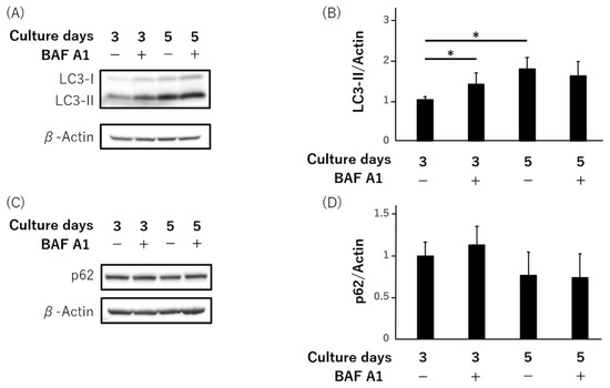 An increase in LC3-II has been reported during differentiation of CTB to STB. However, this does not always indicate autophagy activation in trophoblasts because it is an early autophagy marker and does not always reflect activation of autophagy flux. We, therefore, assessed autophagic activation in PHT during differentiation by evaluating the protein levels of LC3-II in the presence and absence of BAF A1, which inhibits vacuolar adenosine triphosphatase (V-ATPase) in lysosomes, LC3-II levels increased during syncytialization. However, the increase in LC3-II was observed on day 3, but not day 5, of culturing the PHT (Figure 1A,B). Meanwhile, the protein levels of p62 did not change under these culture conditions (Figure 1C,D). Apoptosis, which was evaluated with the increase in active caspase-3, did not increase in PHT with the BAF A1 treatment (Supplemental Figure S1A). In addition, phosphorylated ribosomal protein S6 kinase (pS6K), a downstream target of mammalian target of rapamycin (mTOR), which inhibits autophagy, was also decreased during syncytialization (Supplemental Figure S1B). Since mTOR activation requires functional lysosomes, BAF A1 enhanced pS6K downregulation in trophoblasts. These results suggest that LC3-II was increased in STB, but the autophagy flux was decreased during syncytialization in PHT cells.
