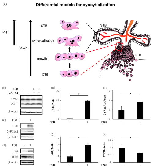 In this study, we provided evidence for three critical findings: first, autophagy activation regulated the initiation of syncytialization in BeWo cells; second, autophagy flux was lower in syncytialized cells than non-syncytialized cells in BeWo cells and PHT cells, and finally, the lysosome, which represents the final step in the autophagy–lysosome machinery, plays a central role in syncytialization in trophoblasts. Thus far, some papers have reported the increase in LC3-II during syncytialization in trophoblasts, suggesting an increase in autophagy in STB [25,26]. The autophagy flux assay in this paper, however, suggested that the terminally syncytialized cells, such as STB, had lower autophagic activity than non-fused cells, such as CTB. Figure 6 presents a schematic model underlying these events. Autophagy flux was activated in the initial period of fusion, but gradually decreased in the latter period. The accumulation of LC3-II might be observed as a consequence of decreased autophagy flux during syncytialization. Meanwhile, as for the regulation of p62, this protein is degraded by the autophagic machinery for a short time in response to starvation [27], but restored to the baseline levels at the end of long culture in some cell lines [28]. In this paper, p62 expression remained stable in PHT, even after a long culture period. Thus, p62 might not be a good marker for assessing the autophagy status in PHT during syncytialization. This is further supported by downregulation of TFEB in the presence of FSK.