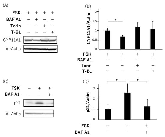 Since autophagy was suppressed during syncytialization, we next evaluated the temporal requirement of autophagy during the CTB differentiation to STB. This was accomplished by evaluating levels of not only CYP11A1 but also p21, a senescence marker [23]. BeWo cells were treated with BAF A1, an autophagy inhibitor, or torin1, T-B1, autophagy activators, in the presence of FSK. Expression of CYP11A1 was significantly decreased by BAF A1 treatment, but not the autophagy activators (Figure 3A,B). The cell proliferation was decreased in torin1, but not BAF A1 or T-B1 (Supplemental Figure S3A). To evaluate the neutralizing effect of BAF A1, we studied acidic vesicles stained with LysoTracker and observed that these vesicles were reduced in BeWo cells (Supplemental Figure S3B). In addition, BAF A1 significantly inhibited the increase in p21 expression, which was promoted during syncytialization in BeWo cells (Figure 3C,D). To further evaluate whether autophagy suppression affects cell–cell fusion, the fusion index in BeWo cells was estimated 72 h post treatment with FSK and BAF A1. As a result, the number of fused cells, which was significantly increased by the administration of FSK, was markedly decreased in response to BAF A1 (Figure 3E–H). These results indicated that autophagy inhibition induced failure of syncytialization in BeWo cells.