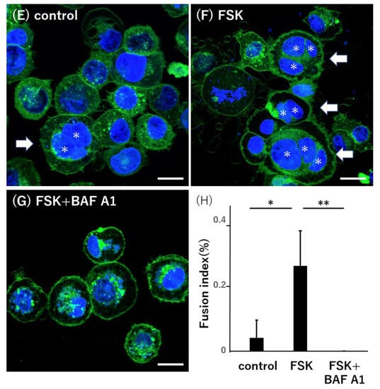 Cell membranes and nuclei were stained with Di-8-ANEPPS (1:1000, 19451, Cayman Chemica), and Hoechest33342 (1:1000, H342, DOJINDO LABORATORIES, Kumamoto, Japan) [20]. The cell fusion index was adopted from the previous report [20]. In brief, unfixed BeWo cells, which were treated with 25 μM FSK, DMSO, FSK with 20 nM BAF A1, or FSK with 1 mM LLOMe for 72 h, were stained with the dyes. For detecting acidic organelles, BeWo cells were treated with LysoTracker DND-99 for 40 min at 37 degrees prior to fixation (1 µM, L7528, Thermo Fisher Scientific, Waltham, MA, USA). Immediately, the images were obtained using confocal microscopy, with a Zeiss LSM 700 confocal microscope (Zeiss, Oberkochen, Germany). Then the acquired images were analyzed using the ZEN image software.