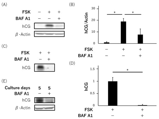 Since autophagy inhibition inhibited the CTB fusion into STB, we next examined whether autophagy inhibition affected trophoblast functions, hCG production and secretion in BeWo cells. The results showed that intracellular hCG induced by FSK was significantly decreased by the BAF A1 treatment (Figure 4A,B). To be consistent with that, hCG secreted in the culture media was also suppressed completely (Figure 4C,D). In addition, similar results were obtained with Wortmannin, which inhibits the generation of autophagosomes, suggesting that inhibition of autophagy impairs the trophoblast functions during differentiation (Supplemental Figure S4). In PHT cells, BAF A1 also suppressed the intracellular hCG production along with differentiation (Figure 4E). Collectively, our data suggest that BAF-A1-mediated autophagy inhibition and syncytialization were responsible for the decrease in hCG production in BeWo cells and PHT cells.