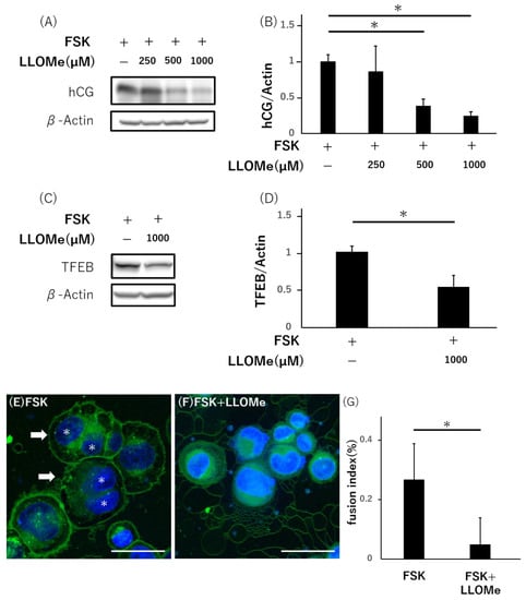 LLOMe induced the failure of syncytialization in BeWo cells. The hCG production was evaluated in BeWo cells with the indicated concentration of LLOMe in the presence of FSK (A). The graph shows the intracellular hCG levels in BeWo cells with LLOMe and FSK (B). Protein expression of TFEB was evaluated as a central regulator of autophagy (C). The graph shows the quantified protein levels of TFEB (D). BeWo cells were treated with FSK 25 μM for 72 h to promote fusion (E), and simultaneously treated with LLOMe (F). The cell membrane was stained with Di-8-ANESS (green) and nuclei with DAPI (blue). The fused cells, which are indicated with arrows, included multiple nuclei indicated with asterisks. Scale bar: 50 μm. The fusion index was shown in (G). Six randomly selected fields of view were captured and used for analysis. The graphs were obtained from the three independent results. A significance test was performed: * p < 0.05.
