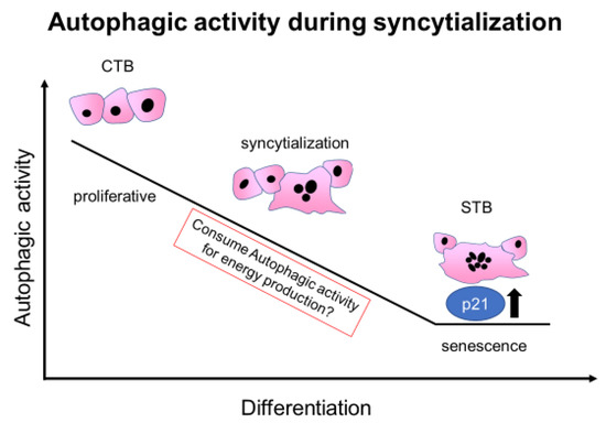 The model of autophagic activity during syncytialization Autophagic activity was sustained in CTB. The activity in STB was lower than that in CTB, suggesting that its activity was gradually decreased during syncytialization. The correct terminally syncytialized cells expressed p21, a senescent marker, as well as hCG and CYP11A1. A lysomal inhibitor, BAF A1, and a lysosomotropic agent, LLOMe, induced the failure of syncytialization, which were characterized by no increase in p21, CYP11A1, and hCG, in BeWo cells. Collectively, autophagic activity might be required for the initiation of syncytialization.