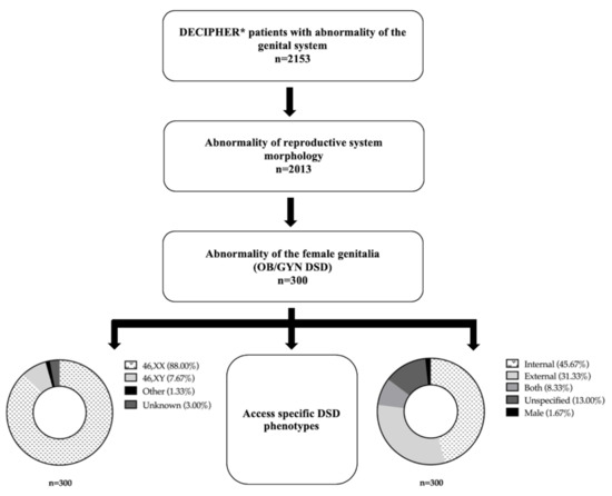 While the rate of molecular diagnosis is higher in 46, XX DSD patients compared to 46, XY DSD patients (64% vs. 12% respectively), the majority, if not all, of those are diagnosed with CAH [11,15,16]. The remaining 46, XX DSD patients often do not know the genetic etiology of their conditions, and historically, such patients have been diagnosed using phenotypic presentation. Indeed, geneticists have begun focusing on patient comorbidities and malformative syndromes with documented DSD for clues into the genetic origin of atypical genital development [17,18].