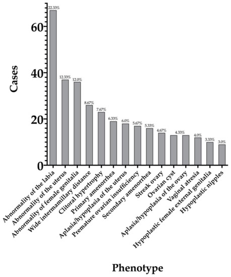 Genotypic and Phenotypic Characterization. We identified 300 patients (access date: 16 June 2020) with a spectrum of phenotypic findings including, but not limited to, aplasia/hypoplasia of reproductive structures, endocrine dysfunction, neoplasms, and cysts (Supplementary Table S1). There were 191 patients that only exhibited 1 DSD phenotype, while 108 exhibited two or more. One patient did not have any apparent DSD phenotypes. Additionally, 137 patients had DSD phenotypes that solely affected the internal genitalia while 94 patients had DSD phenotypes that only affected the external genitalia (Figure 1). Both internal and external genitalia were atypical in 25 patients. Very few patients (n = 5) exhibited atypical male phenotypes. 39 patients were classified as unspecified due to ambiguity in their reported phenotypes. Most of the patients (n = 264) that exhibited atypical female genitalia had a 46, XX sex chromosome complement, while 23 individuals were 46, XY (Figure 1). The remaining 13 did not have a known sex (n = 9) or were classified as “other” (n = 4). Patients exhibited a variety of phenotypes, with abnormality of the labia, abnormality of the uterus, and abnormality of the female genitalia being the most common (Figure 2).