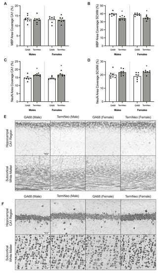 Myelin basic protein (MBP) and neuronal nuclei (NeuN) immunostaining was quantified in the brain of fetal GA68 (white; males n = 7, females n = 7) and term neonates (grey; males n = 8, females n = 7) for (A,C) the CA1 region of the hippocampus and (B,D) the overlying subcortical white matter. Data presented as means ± SEM with * indicating significance at p < 0.05. Representative photomicrographs of (E) MBP and (F) NeuN immunostaining of the CA1 region and overlying subcortical white matter. Scale bar = 50 μm.