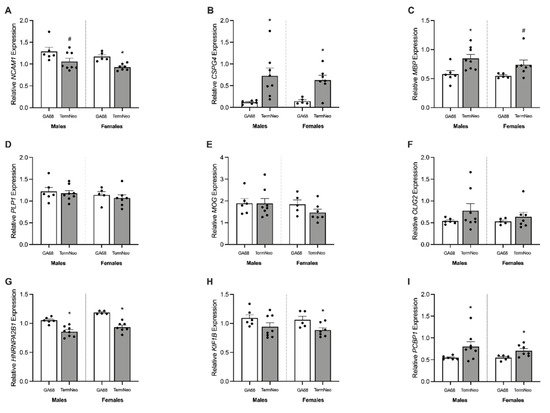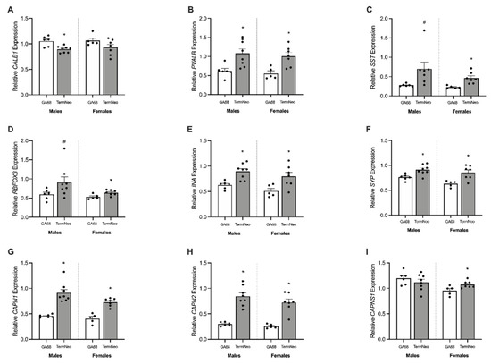 Relative mRNA expression for neuron and neuronal growth markers in the hippocampus of fetal GA68 (white; males n = 6, females n = 5) and term neonates (grey; males n = 8, females n = 7). (A) CALB1, (B) PVALB, (C) SST, (D) RBFOX3, (E) INA, (F) SYP, (G) CAPN1, (H) CAPN2, and (I) CAPNS1. Data presented as means ± SEM with * indicating significance at p < 0.05, and # representing a non-significant trend.
