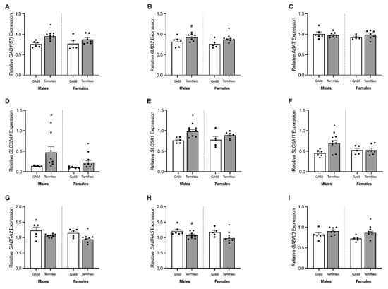 Relative mRNA expression for GABA synthesis, breakdown, transport, and receptor markers in the hippocampus of fetal GA68 (white; males n = 6, females n = 5) and term neonates (grey; males n = 8, females n = 7). (A) GAD1(67), (B) GAD2, (C) ABAT, (D) SLC32A1, (E) SLC6A1, (F) SLC6A11, (G) GABRA2, (H) GABRA5, and (I) GABRD. Data presented as means ± SEM with * indicating significance at p < 0.05, and # representing a non-significant trend.