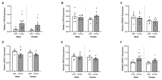 Relative mRNA expression for steroid synthesis and receptor markers, and DNA methyltransferase enzyme in the hippocampus of fetal GA68 (white; males n = 6, females n = 5) and term neonates (grey; males n = 8, females n = 7). (A) TSPO, (B) STAR, (C) SRD5A1, (D) NR3C1, (E) NR3C2, and (F) DNMT1. Data presented as means ± SEM with * indicating significance at p < 0.05, and # representing a non-significant trend.
