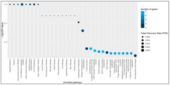 By exploring the diseases associated with the immune related pathways such as Systemic Lupus Erythematosus, Autoimmune thyroid disease, Graft versus host disease, Type I diabetes mellitus, and Asthma we found that in most cases there is a combined effect of multiple genes rather than driven by a single gene (Figure 2 and Supplementary Materials Table S1).