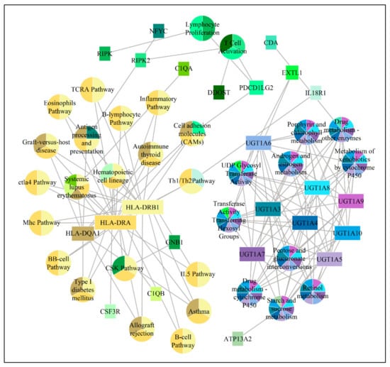 Network of genes associated with enriched pathways. Square and circular nodes represent the genes and enriched pathways respectively. Size of square node is proportional to the number of pathways associated with each gene. The circular node is segmented into colored pies to illustrate the associated genes with each pathway. Human leukocyte antigen (HLA) and UDP glucuronosyltransferase (UGT) genes are colored respectively with shades of yellow and blue. Remaining genes are indicated in shades of green. Edge represents a gene-pathway association. The network was created using igraph R package [52].