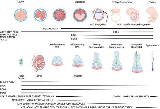 Conserved expression markers during male germ cell development from zygote to mature spermatozoa in vivo. After fertilization, cells undergo a differentiation process where primordial germ cells (PGCs) develop in the embryo and migrate toward the genital ridge, where early PGCs arrest and differentiate into gonocytes. Gonocytes mature during development and eventually develop into spermatogonial stem cells. Spermatogenesis resumes at puberty. Complex orchestrated stage-specific gene expressions regulate the development of gonocytes, and markers and relative expression levels are depicted [43,44,45,46,47,48,49].