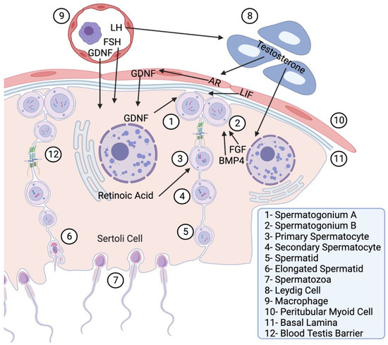 Spermatogenesis is orchestrated by juxtacrine signaling from Leydig cells (8) and myoid cells (10), and paracrine signaling causes cells to divide/develop into haploid gametes. The first stage of spermatogenesis is slow self-renewing spermatogonia (1). The second stage is actively differentiating or self-renewing spermatogonia (2). Spermatogonia cells enter the committed differentiation process (3), where meiosis starts developing the primary spermatocytes (3), secondary spermatocytes (4), and spermatids (5). Spermatocytes cross the blood–testis barrier (BTB) (12) and enter the lumen. Spermatids undergo spermiogenesis, where cytoplasmic changes produce elongated spermatids (6) and eventually mature spermatozoa (7) [31,32,33,37,38,39,40,41].