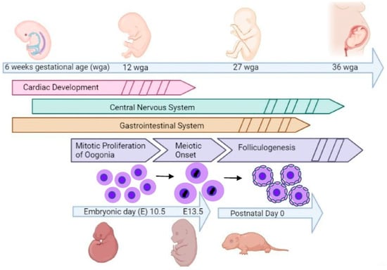 Chemotherapy is not recommended during the first trimester due to a 20% risk of developing congenital malformations [,]. While most of the data to date suggest an increased risk of preterm delivery (both iatrogenic and spontaneous) in children exposed to chemotherapy in utero during the second and third trimesters, these offspring do not appear to demonstrate a significant difference in congenital anomalies, cardiac function, or cognitive abilities [,,,,,,,,,]. However, ovarian reserve and number of oocytes has not been as well studied. As illustrated in Figure 1, the various organ systems have distinct time periods for organogenesis and maturation.