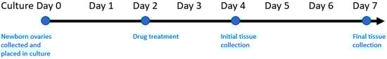 Healthy wild type C57BL/6 mice were purchased from Jackson Labs and bred to produce neonatal pups. Mice were maintained on standard light: dark cycles with laboratory mouse chow provided ad libidum. All female pups on postnatal day (PND) 0 without milk spots were included in collection and randomization. Cages were checked daily, and day 0 newborn pups were collected and euthanized via decapitation. Neonatal ovaries were dissected with tissue forceps and syringe needle in sterilized phosphate-buffered saline (PBS) under a dissecting microscope under sterile conditions.