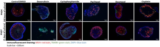 The varying effects of chemotherapeutic exposure were quantified based on their immunofluorescent imaging. Representative images are seen in Figure 3 with oocytes being shown with dual markers of MVH and TRA98.