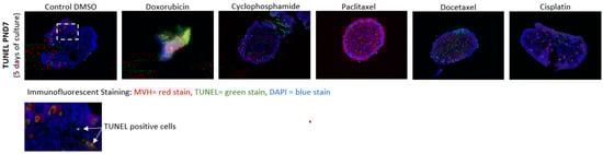 Terminal deoxynucleotidyl transferase dUTP nick end labeling (TUNEL) staining demonstrating cell death across chemotherapeutic exposures.