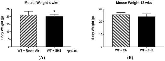 Body weights of 4- and 12-week-old animals exposed to antenatal secondhand smoke (SHS). A significant decrease in body weights (1.0-fold; p < 0.03) was observed in the 4-week-old animals when compared to room air (RA) controls (A). No significant differences in body weights were observed when comparing 12-week animals to RA controls (B). * Statistically different from control (p < 0.05).
