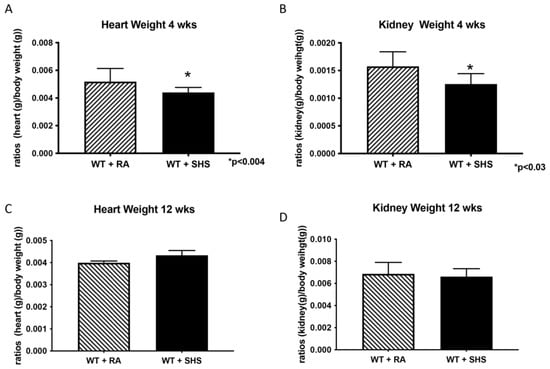 Previously, we demonstrated reduced fetal weight (n = 12) following antenatal exposure in an SHS-induced mode of IUGR []. In the current study, we still observed reduced weight postnatally in mice 4 weeks of age after antenatal exposure to SHS (Figure 1A, 1.0-fold; p < 0.03). This difference in animal weights when comparing antenatal RA and SHS was not detected when the mice reached 12 weeks of age (Figure 1B). As previously mentioned, maternal exposure to cigarette smoke affects the development of the heart and kidneys [,,]. Offspring showed decreased heart (1.2-fold; p < 0.004) and kidney (1.3-fold; p < 0.03) weights at 4 weeks of age (Figure 2A,B); however, these weights were not different at 12 weeks of age (Figure 2C,D).