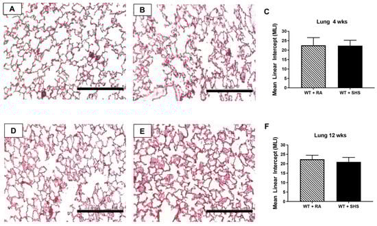 After embryonic development, RAGE remains notably expressed in lung tissue and only minimally expressed in most other tissues. At 4 weeks of age, mice that antenatally encountered SHS still expressed significantly more RAGE in pulmonary tissues when compared to RA controls. This was interesting, as these expression data confirmed our previous observations and showed that even after 4 weeks, the initial antenatal SHS stimulus was sufficient to maintain elevated RAGE expression. Furthermore, if RAGE expression remained higher than controls, such a discovery would implicate ongoing inflammatory RAGE-mediated signaling. By extension, the observation that RAGE expression waned to the same levels as RA controls at 12 weeks of age portends inflammatory RAGE signaling becomes diminished during the “catch-up” process experienced by intrauterine growth-restricted offspring. Abundant research has shown that RAGE up-regulation leads to inflammatory outcomes that include decreased cell turnover and pulmonary simplification [,,]. We, therefore, assessed overall lung morphology via screening mean linear intercepts to assess lung simplification at 4 weeks and 12 weeks of age. Because we observed no significant differences between treated and control animals regardless of age, we can correctly assume that SHS-induced lung compromise did not affect histological architecture in the parenchyma.