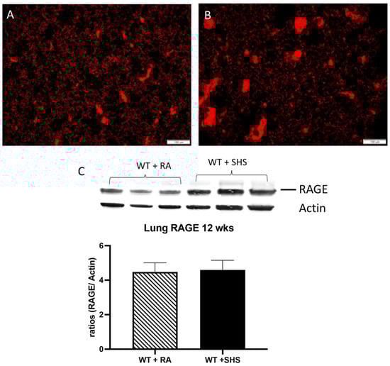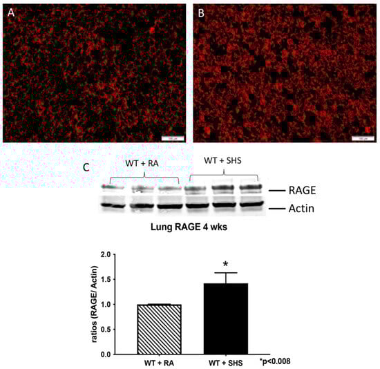 RAGE expression in the lungs of 12-week animals exposed to antenatal secondhand smoke (SHS). RAGE immunofluorescence was qualitatively assessed in lung sections. Scale bars represent 200 μm using a 20× objective from mice exposed to RA (A) or SHS (B). Immunoblotting for RAGE (C) revealed a significant increase in RAGE expression in lungs from 12-week-old mice exposed to antenatal SHS compared to 12-week-old RA controls. * Statistically different from control (p < 0.05).